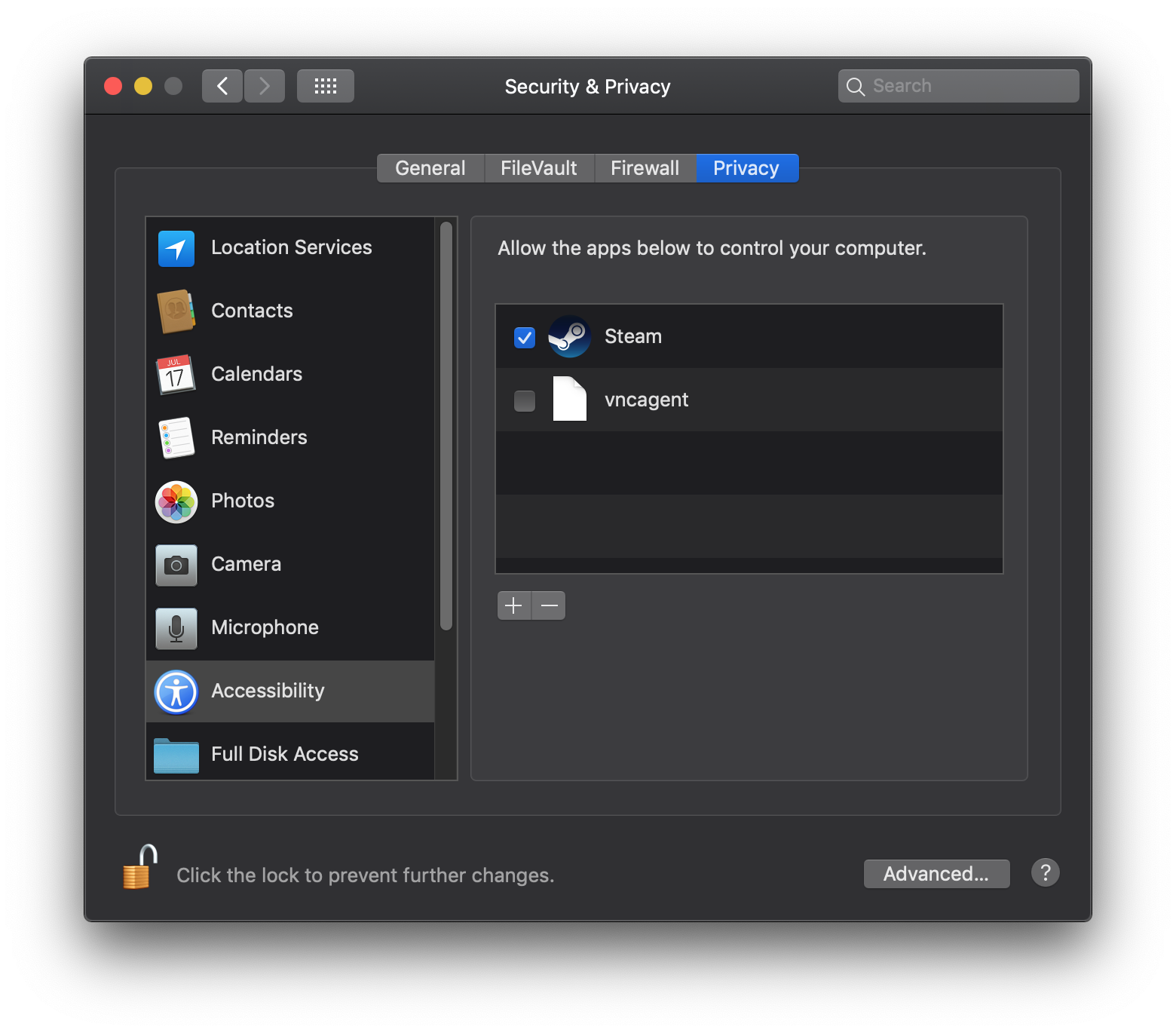 2. Select the Privacy tab, then Accessibility from the menu on the left. There “unlock” changing settings by clicking on the lock icon.